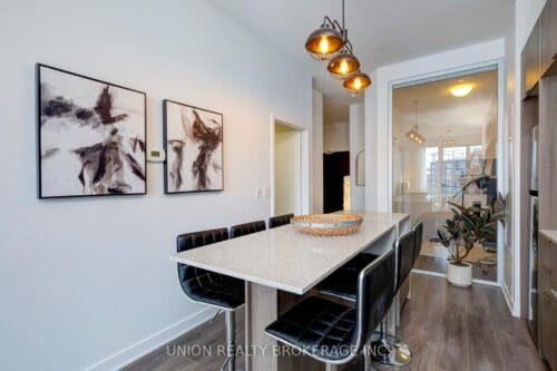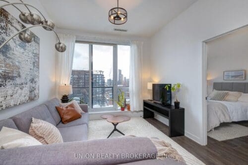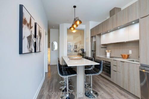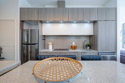 Welcome to the penthouse! This exceptional two-bedroom, two-bathroom residence features eleven-foot ceilings and a highly functional layout designed to maximize every square foot. Bathed in natural light, the unit offers stunning west-facing views of the city skyline and the CN Tower. A spacious entryway leads into a kitchen equipped with a large stone island-perfect for gatherings-and a pantry providing ample storage. The living room features wall-to-wall windows with a direct walk-out to a private balcony. The primary bedroom includes expansive west-facing windows, a double closet, and a four-piece ensuite bathroom. The second bedroom also offers a double closet and a glass wall that allows for significant natural light.This unit includes both parking and a locker. Residents also enjoy access to a wide range of amenities, including a concierge, party room, bike storage, billiards and media rooms, a basketball court, business centre, gym, squash court, and a rooftop deck and garden. Ideally situated, the building is a short stroll from shopping on Queen St, the Distillery District, and Riverside, as well as various parks and community centres. With the TTC at your doorstep and easy access to the DVP, this location is perfectly connected.