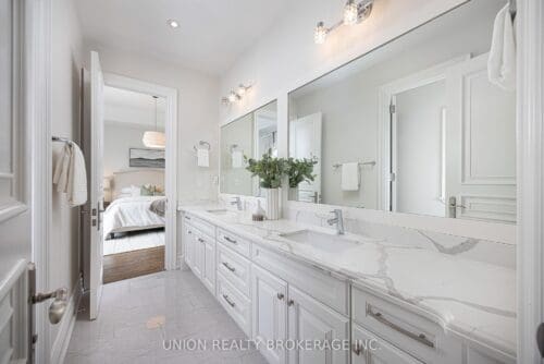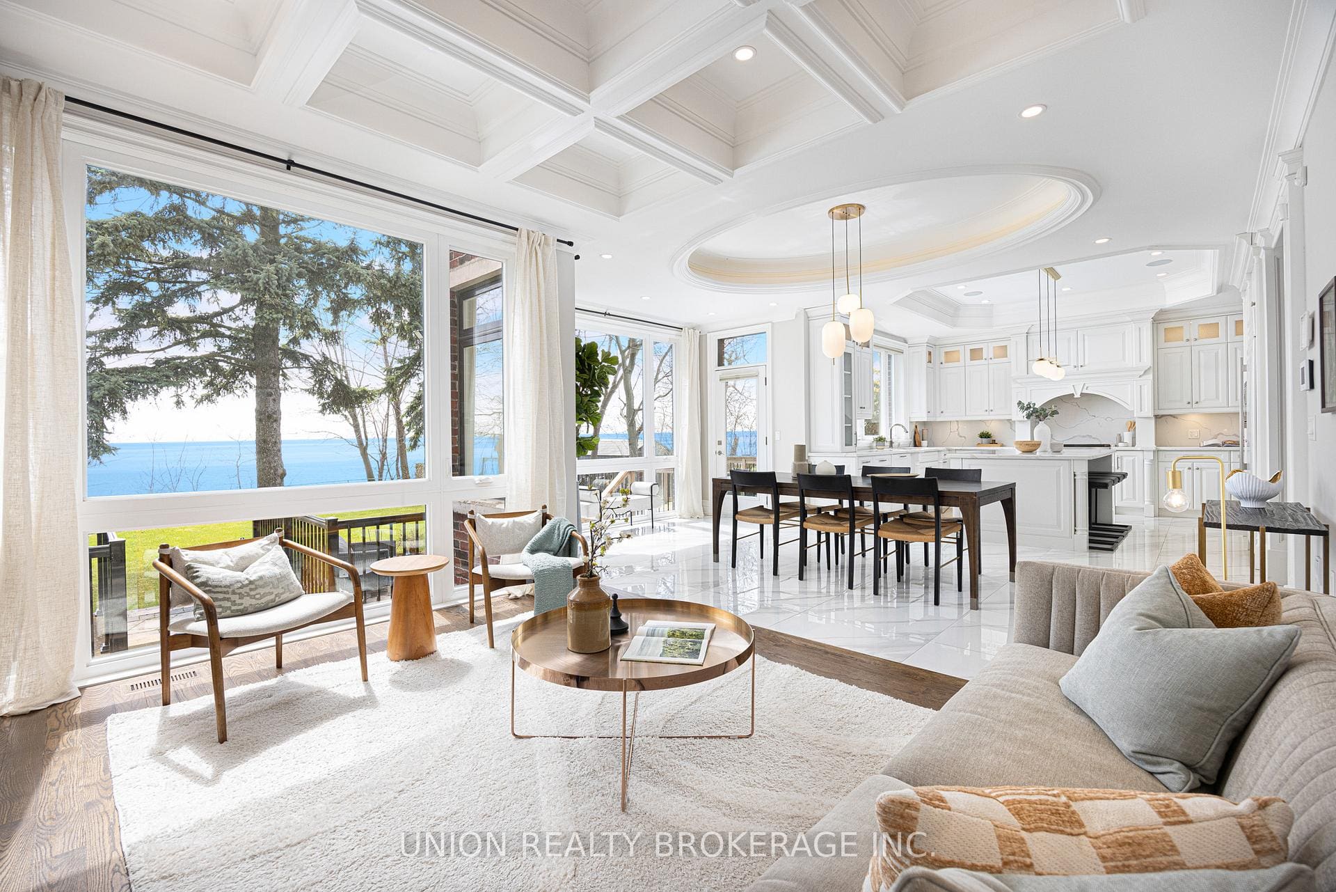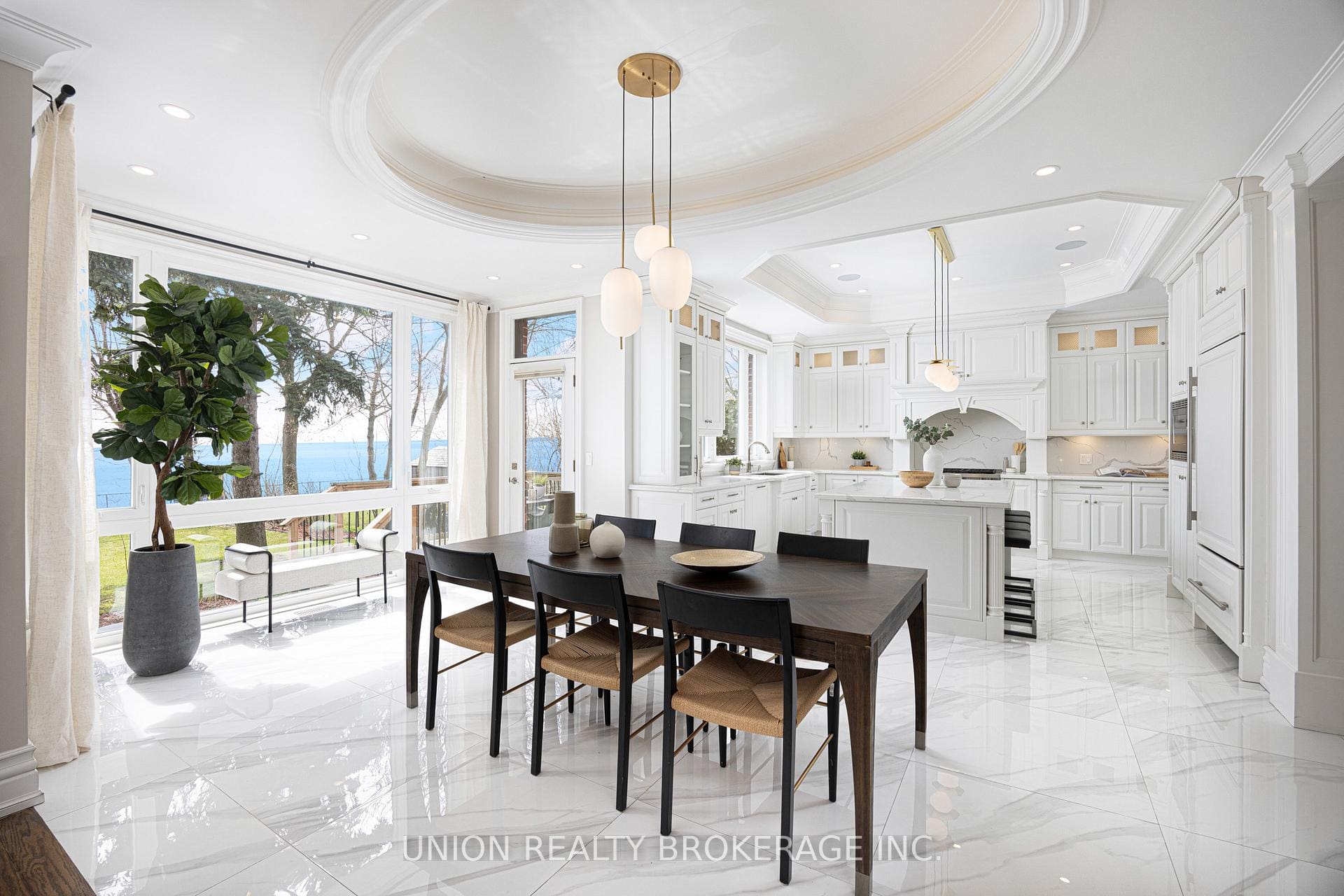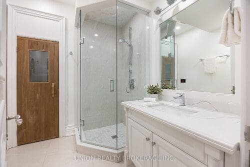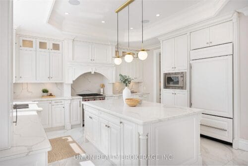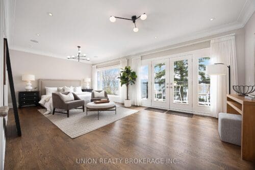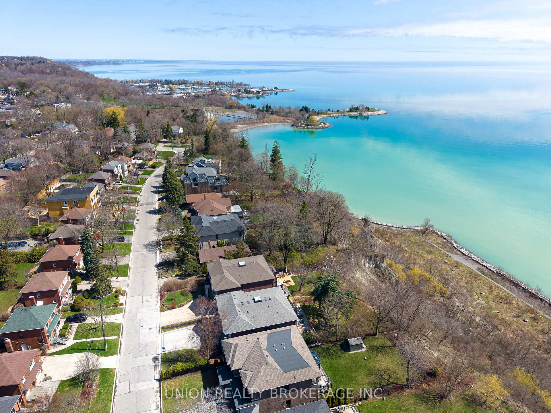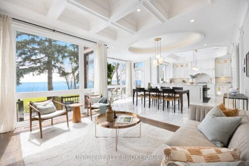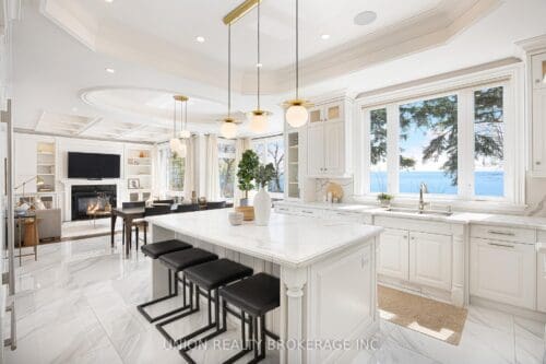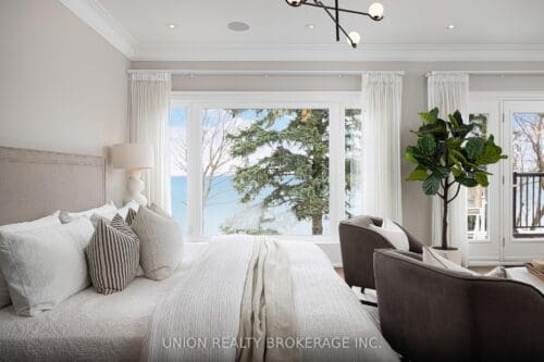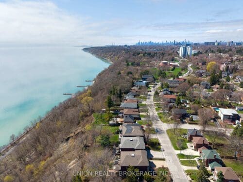 In the entire city of Toronto there are only a handful of waterfront single family homes. This is one of them. Welcome to 63 Fishleigh Drive, an extraordinary waterfront residence perched along the edge of the Scarborough Bluffs on a massive 230′ deep lot. With nothing between you and the water, the home is defined by its breathtaking sightlines which are showcased through picturesque floor-to-ceiling windows and a private primary balcony overlooking the lake. Inside, thoughtful design meets high-end finishes. This custom built smart home delivers over 5,000 sq ft of refined living space. This stunning home features 5+2 bedrooms and 6 bathrooms, including a main floor office fully customized with wooden trim and cabinetry. The entire back of the house is filled with floor to ceiling windows that flood the main floor with natural light and frame the breathtaking lake views. No detail has been overlooked, with premium finishes throughout, including marble flooring, rich panelled walls, coffered ceilings, cove lighting, and elegant oak hardwood. A grand circular oak staircase and domed ceiling with oculus skylight create a striking architectural statement. The gourmet kitchen is a chef’s dream, complete with Sub-Zero and Wolf appliances, quartz-marble countertops, a butler’s pantry, and a walkout to a deck that captures the full beauty of the setting. The finished walk-out basement is a true retreat, featuring a private home theatre, custom wet bar, sauna, and a glass-enclosed wine closet, all opening to a beautifully landscaped backyard oasis perched above the shoreline. Additonal features include a double car garage, 200amp panel, central vacuum, security system with full perimeter camera system, landscape irrigation, and much more. This is truly a unique property and a rare opportunity to own one of the city’s most exclusive lakefront homes.